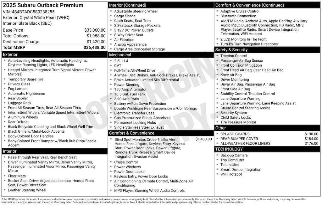 We recently retired and purchased a 2024 Outback Premium and love it! It’s got all the “bells & whistles” we need, plus the safety and reliability of a Subaru. We like to drive up to Lake Tahoe a lot and appreciate the AWD and “X Mode” for slippery driving conditions. - 5.0