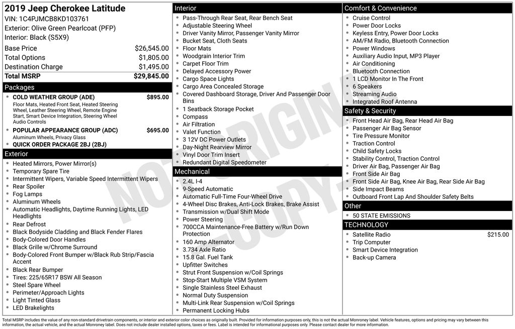 This 2019 Jeep Cherokee Latitude is a versatile and well-equipped SUV that's ready to take on any adventure. Under the hood, you'll find a 2.4L I4 engine paired with a 9-Speed 948TE Automatic transmission, delivering a smooth and efficient driving experience. With 4-wheel drive capabilities, this Jeep is ready to tackle any terrain, whether you're navigating city streets or exploring the great outdoors.