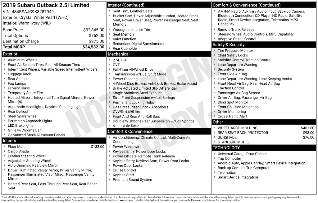 When our Honda CRV was totaled by an idiot in a pick up truck, we started shopping around. We examined all the other alternatives from Ford, GM, Honda, Toyota, Nissan, Hyundai, but it was when the Outback was taken for a test drive it IMMEDIATLY set itself apart from its competitors! Road noise, minimal; interior comfort, OUTSTANDING; road handling, a dream; electronics, mind-blowing array including safety systems; ALSO, and you cannot find this on ANY 2019 SUV in it's class, a CD PLAYER in addition to the satellite and broadcast radio! Yep, a physical real CD player, which means we don't have to put all our music on USB sticks! Ours is the 4 cylinder model, but even still, when you kick down on the accelerator (not the paddle switch on the steering wheel) it can deliver some very impressive acceleration! The back is absolutely cavernous compared to its competition, even before you put the rear seats in a down position! The array of controls available on the steering wheel is impressive to say the least, and will take a bit of learning to get fully comfortable with. When you consider ALL of the standard features, including safety features, that are extra on most of its competition, together with how the vehicle itself performs, this really is a no brainer! Detroit has a LOT of catching up to do, & mainstream Japan automakers, while maybe having the same technology, don't even come close to this level of appointments as standard at this price point! - 5.0