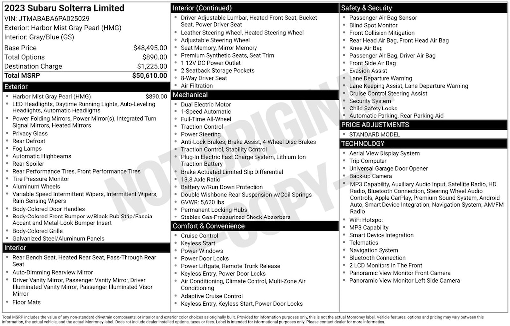 - Tracker system: Subaru Solterra Connect - Remote Connect (1 year trial included)