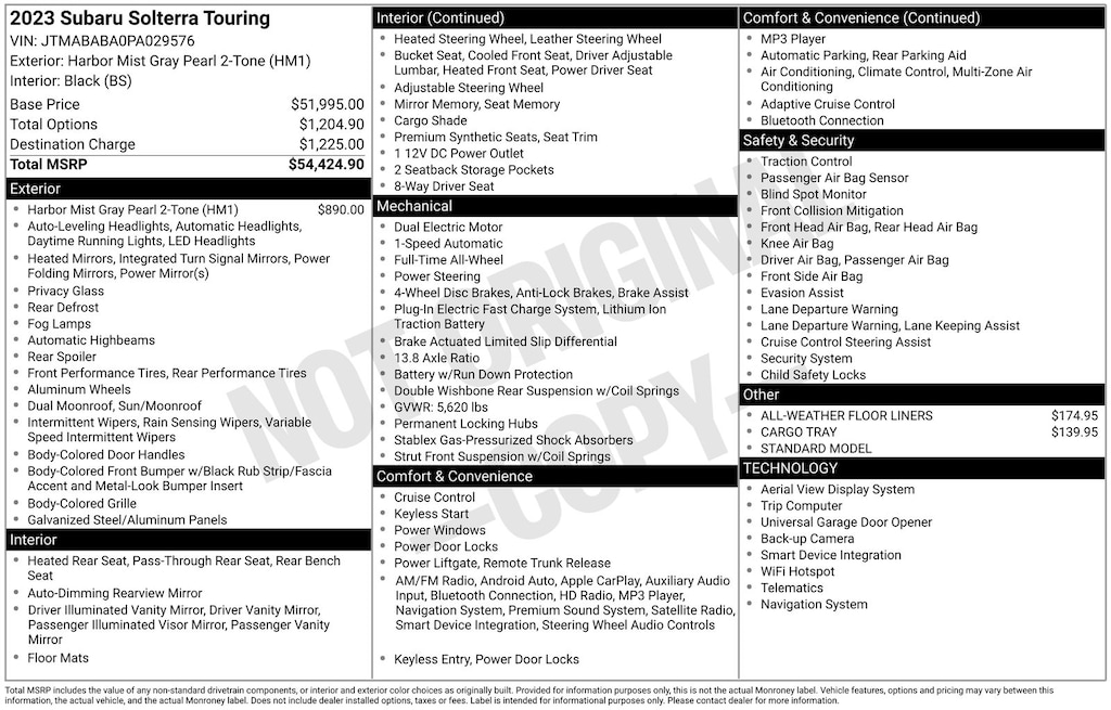 - Tracker system: Subaru Solterra Connect - Remote Connect (1 year trial included)