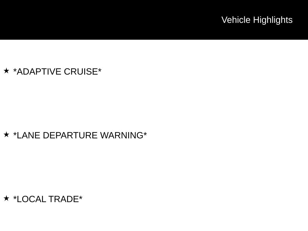 - Adaptive Cruise Control: (ACC) Adaptive Cruise Control w/Stop & Go